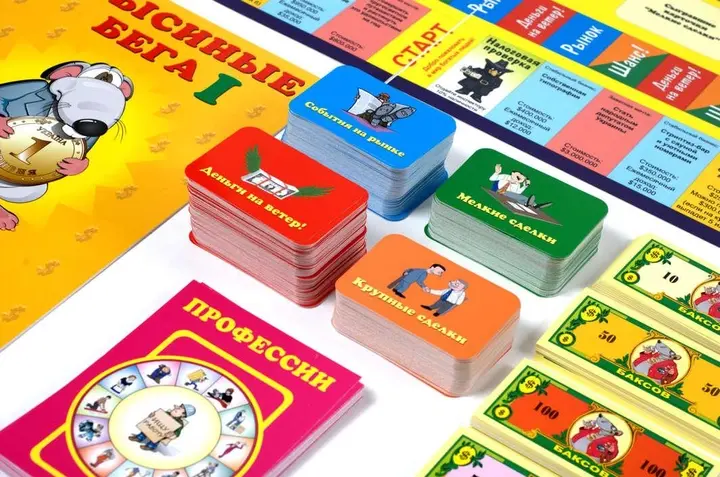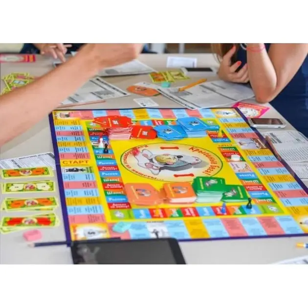 Гра абсолютно нова, фабрична, що не підроблена, що не самопальна. Фабричне якість, величезна шикарна ламінована коробка, добре підійде на подарунок. Усередині яскраве кольорове ламіноване ігрове поле, причому найбільше яке тільки можна надрукувати друкарським способом - 80 х 56 см. Зручно навіть для гри на 8 осіб. Кольорові лаковані картки на товстому картоні з округленими кутами - не мнуться, що не заламувати, не розшаровуються. Величезний набір яскравих лакованих грошей на крейдованому глянцевому папері - 12 номіналів по 50 купюр = 600 купюр!