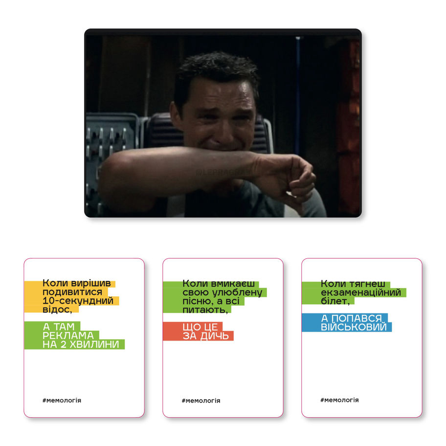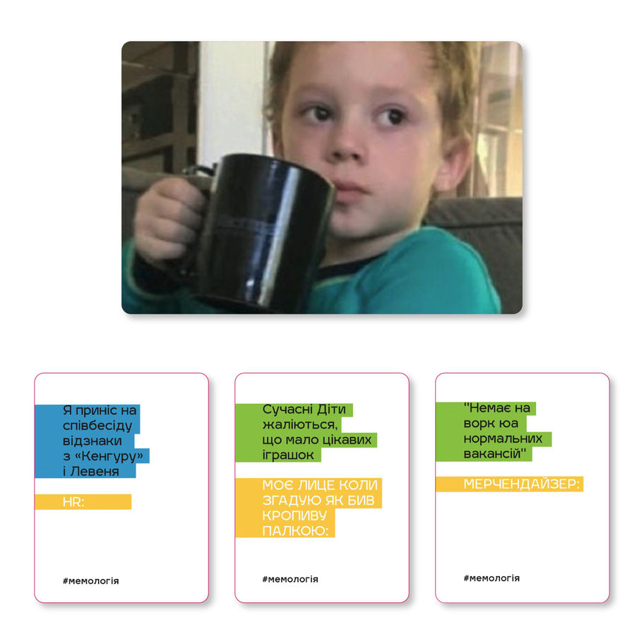 #Мемологія Класична – культова гра про #меми українською мовою, в якій гравці повинні поєднувати картки мемів та текстові картки.
